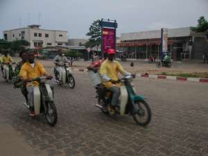 COTONOU: les Zemidjans (taxis-mobylettes) reconnaissables à leurs chemises jaunes.